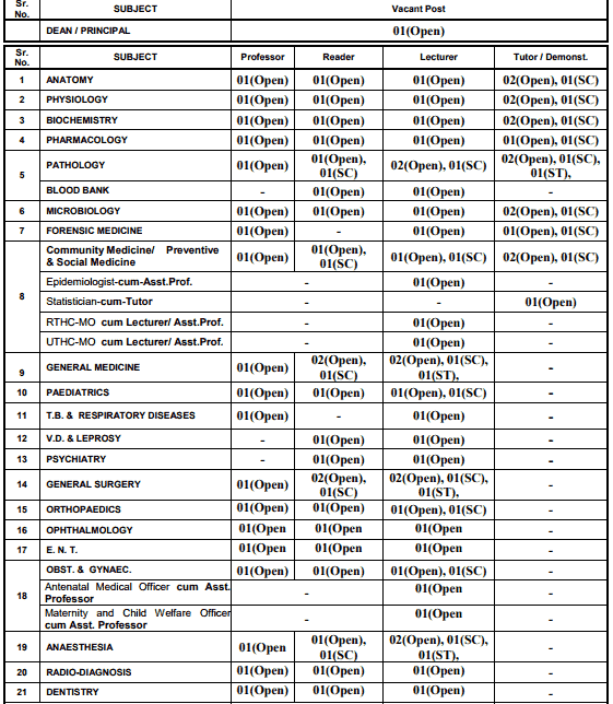 Dean/Principal Eligibility Criteria – Post Graduation in medical Qualification and Ten years Teaching Experience as Professors, Associate Professors/Reader in a Medical College. Total Post – 01(Open). Professor Eligibility Criteria – Post Graduation in medical Qualification and Three years Teaching Experience as Associate Professors. Total Post – 19(Open). Reader Eligibility Criteria – Post Graduation in medical Qualification and Four years Teaching Experience as Assistant Professors. Vacancy – Open – 22 | SC – 05. Total Post – 27. Lecturer Eligibility Criteria – Post Graduation in Concerned Subject With Three Years teaching Experience in Medical College. Vacancy – Open – 31 | SC – 08 | ST- 03. Total Post – 42. Tutor/Demonst Eligibility Criteria – M.B.B.S or M.Sc. in Any Subject as Specified by M.C.I. Vacancy – Open – 15 | SC – 08 | ST – 01. Total Post – 24. For More Vacancy Details Please Check the Image Given Below. Click the below image to Zoom in