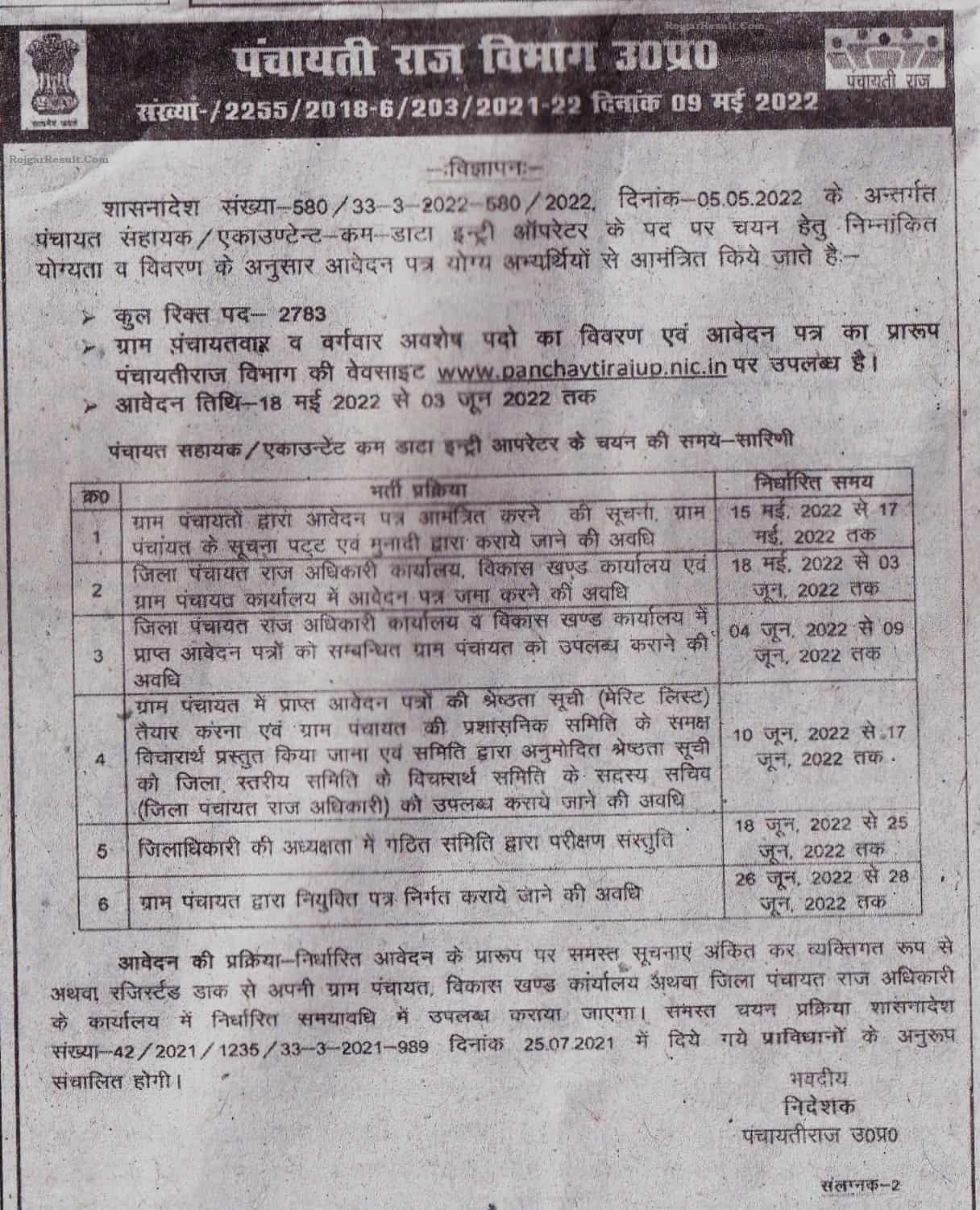 UP Panchayati Raj Department 2783 Sahayak Cum Data Entry Operator Online Form 2022 Recruitment